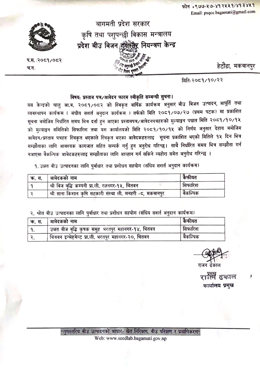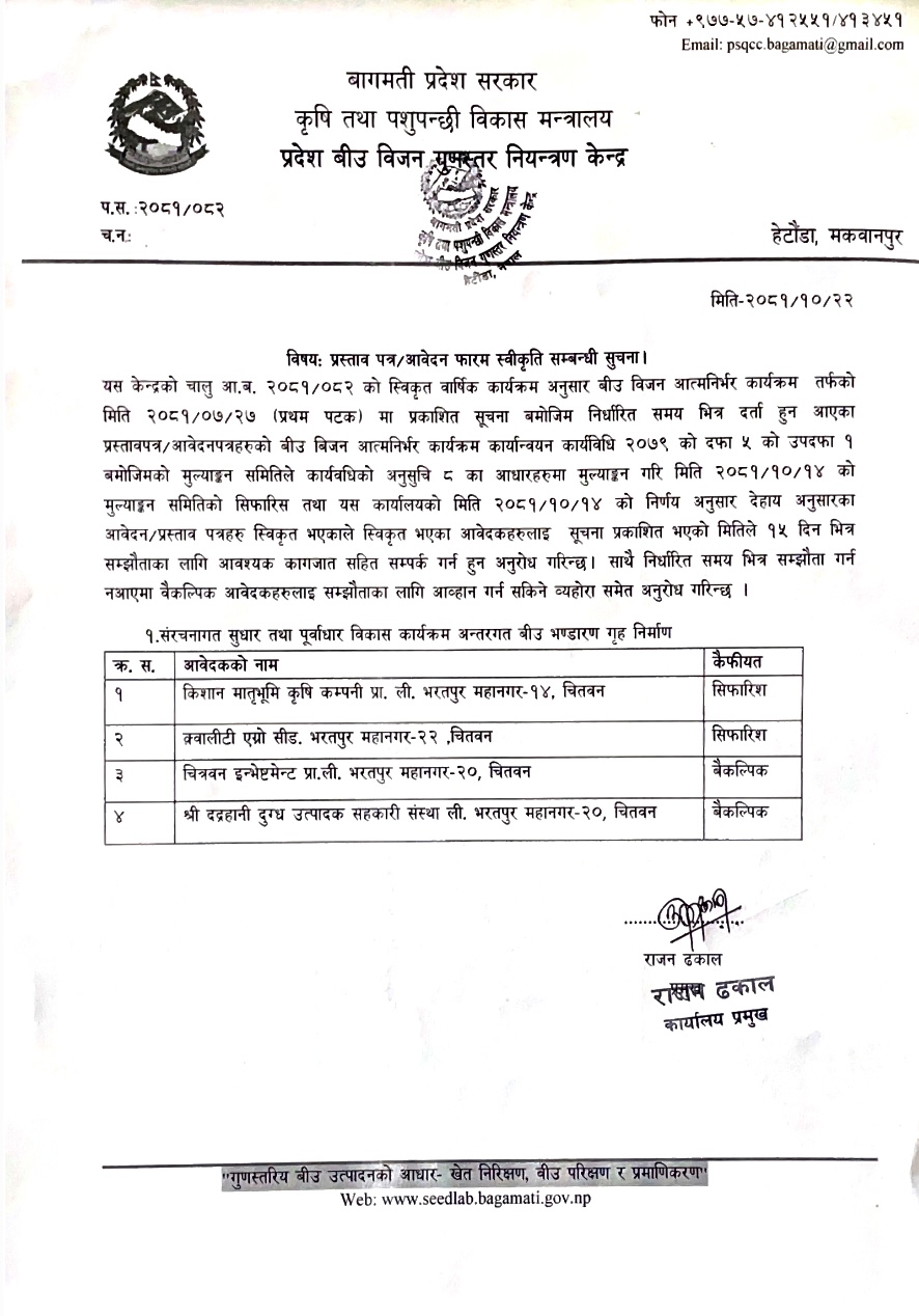 पुर्वाधार निर्माण तर्पका प्रस्तावपत्र/आवेदन पत्र स्विकृत सम्वन्धि सूचना (बीउ बिजन आत्मनिर्भर कार्यक्रम) 2081-10-22 Closed !!!