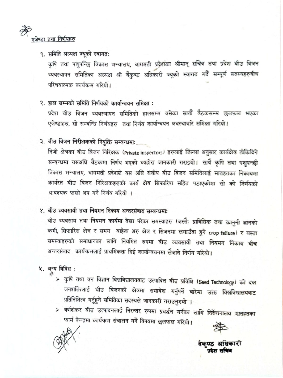 प्रदेश बीउ बिजन व्यवस्थापन समितिको आठौं वैठकको निर्णयहरु 2082-02-25 Continuous